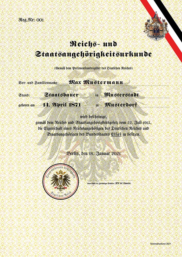 Ab dem 01.01.2021 erhalten Sie mit der Bestellung dieser Reichs- und Staasangehörigkeitsurkunde